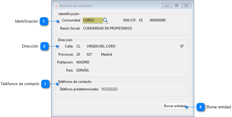 Muestra los datos de dirección de la entidad que se quiere borrar para tener confirmación de que la selección es correcta. |
