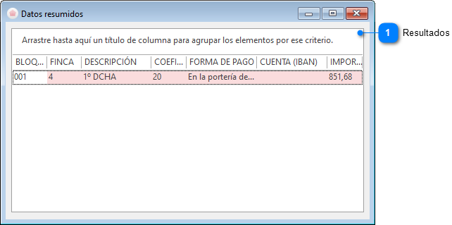 Para ello nos colocaremos en la fila que contiene el propietario, la dirección o el inquilino del que deseamos obtener más información y una vez en ella haremos clic en el botón Más datos. En ese momento se desplegará otro diálogo que nos mostrará la siguiente información: •Código del bloque/portal o código de la propiedad. •Código de la finca o del elemento de la propiedad. •Descripción de la finca o del elemento de la propiedad. •Coeficiente de escritura. •Forma de pago. •IBAN. •Importe de los recibos pendientes. |