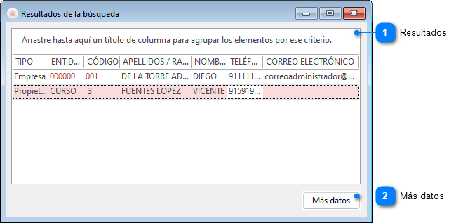 Si en la pantalla de resultados aparecen datos que no corresponden a los criterios de selección es debido a que en algunas fichas existen varias direcciones o teléfonos y se busca en todos ellos. Ejemplo: En la ficha del propietario hay datos de la dirección particular y de correspondencia, si la persona a la que se envía la correspondencia es distinta del propietario puede que ésta coincida con los criterios de búsqueda (aunque el propietario no) y en los resultados aparecerá el propietario.