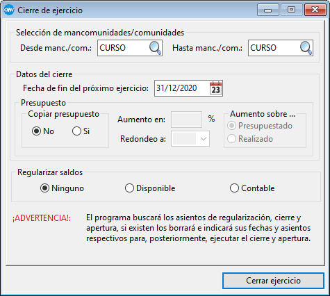 Este dialogo lo utilizaremos para realizar el cierre del ejercicio contable de la mancomunidad/comunidad.
