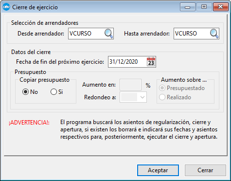 Este diálogo lo utilizaremos para realizar el cierre del ejercicio contable del propietario.