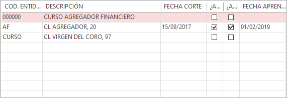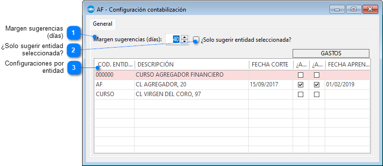 Por cada entidad podremos configurar su fecha de corte, si se desea realizar la contabilización de los movimientos de forma automática, sin intervención alguna, y la fecha de comienzo de aprendizaje para la contabilización automática.