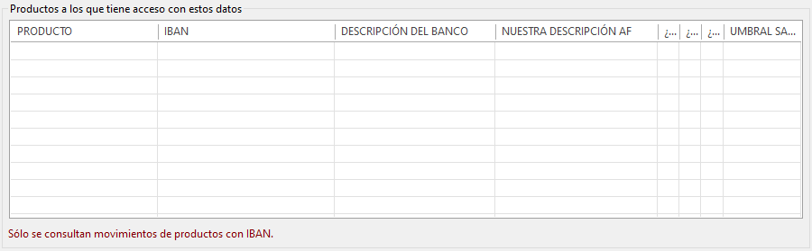 Cada producto se compone de los siguientes datos: •Producto: es un código interno que asigna la entidad bancaria al producto, por lo tanto, no podrá ser modificado. •IBAN: es el código internacional de cuenta bancaria asignado al producto. El IBAN lo asigna la entidad bancaria, por lo tanto, no podrá ser modificado. Al obtener el IBAN se realiza una búsqueda en el plan de cuentas del espacio de trabajo, si ninguna cuenta contable bancaria tiene configurado el IBAN comunicado por la entidad bancaria éste se guardará en blanco. Si observa algún producto con su IBAN en blanco deberá analizar el motivo y, si fuese necesario, crear / modificar la correspondiente cuenta contable bancaria con el fin de que tenga correctamente configurado el IBAN. Tras esta operación deberá de volver a actualizar los productos asociados a los datos de acceso para que figure el IBAN en el correspondiente producto. Sólo los productos con IBAN podrán ser manejados por el módulo. •Descripción del banco: es la descripción que facilita la entidad bancaria para el producto, por lo tanto, no podrá ser modificada. •Nuestra descripción AF: es una descripción completamente configurable por usted y que le permitirá identificar el producto dentro del módulo. Por defecto su valor será: código de entidad + descripción de la entidad. •¿Activo?: Indica si se realizarán consultas de movimientos para el producto. Si ha dado de baja el producto, pero quiere serguir visualizándolo, en lugar de borrar el producto deberá de desmarcar este check. •¿Consulta N43?: Indica si se realizarán consultas de ficheros de N43 para el producto. Si el producto no permite consultas de N43 quizás quiera desmarcar el check, de esta forma evitará que se notifique el error de N43 cada vez que actualice los productos en la pantalla de consultas. •¿Consulta devoluciones?: Indica si se realizarán consultas de ficheros de devoluciones para el producto. Si el producto no permite consultas de devoluciones quizás quiera desmarcar el check, de esta forma evitará que se notifique el error de ficheros de devoluciones cada vez que actualice los productos en la pantalla de consultas. •Umbral saldo: se trata del saldo mínimo a partir del cual se considera que el saldo está por debajo de un límite razonable. Por defecto su valor será de 0 euros, es decir, el sistema avisará cuando el saldo del producto esté en negativo.