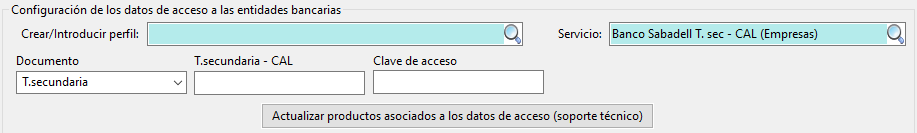 El primer campo (no siempre visible) es un selector del tipo de documento que queremos usar para conectarnos contra la entidad bancaria. Observamos, por ejemplo, que en el caso del Banco Sabadell tarjeta secundaria (Empresas) podremos conectarnos mediante Tarjeta secundaria o CAL. |