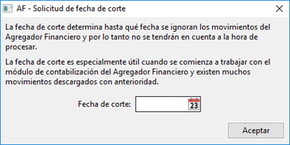 La fecha de corte la puede modificar siempre que quiera, tanto para indicar una fecha mayor como una fecha menor, variando la cantidad de movimientos que se muestran en las pantallas del módulo de contabilización del Agregador Financiero. Lo podrá hacer desde la pantalla de configuración de la contabilización AF.