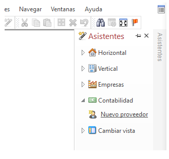 Se accede desde el menú <Contabilidad> <Cuentas contables> <Nuevo proveedor>. O desde el grupo Contabilidad en el panel de asistentes, situado en el margen derecho de la aplicación, donde encontrará la opción Nuevo proveedor.