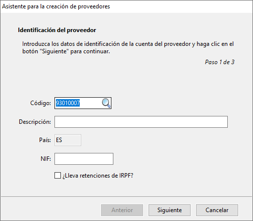 El primer paso para la creación del nuevo proveedor es la introducción de los datos de identificación que están compuestos por un código de cuenta, una descripción y un NIF.
