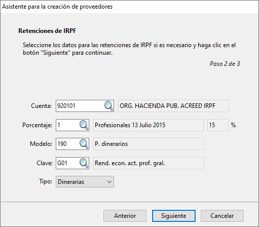 Si en el paso anterior se ha marcado “¿Lleva retenciones de IRPF?” el asistente solicitará la información necesaria para configurar la cuenta del proveedor de cara al registro contable del IRPF y a la generación de modelos para la AEAT.