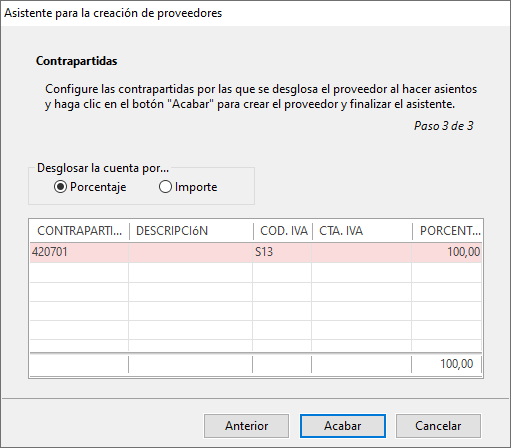 Por último, será necesario configurar el desglose de contrapartidas por defecto para el nuevo proveedor. Recuerde que esta configuración será la propuesta por la aplicación al hacer facturas contra la cuenta contable de este proveedor para desglosar el importe total de la factura.