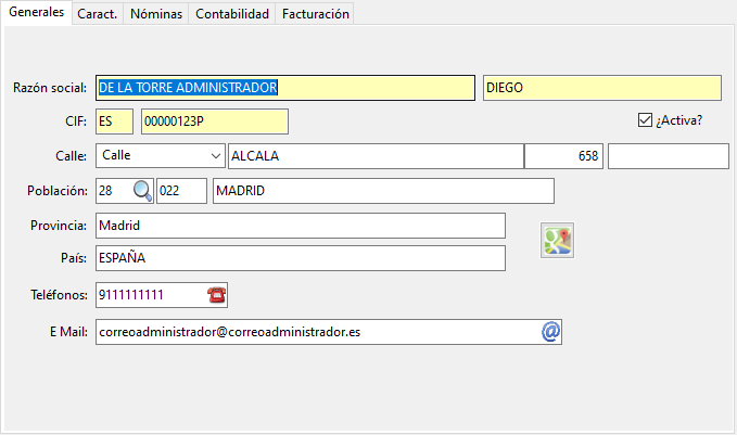 Datos de nombre, CIF, dirección, etc. de cada delegación.