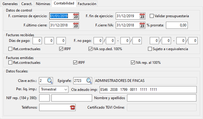 Datos de la empresa relativos a la contabilidad, facturas recibidas, facturas emitidas y datos fiscales.