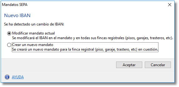 Dado que un mismo mandato puede estar asociado a varias fincas registrales, direcciones de pago y clientes; cambiar el IBAN en alguno de estos registros puede implicar un cambio global (modificar el mandato y todos los registros asociados) o un cambio individual (solo cambiar el registro actual, para el que se genera un nuevo mandato).