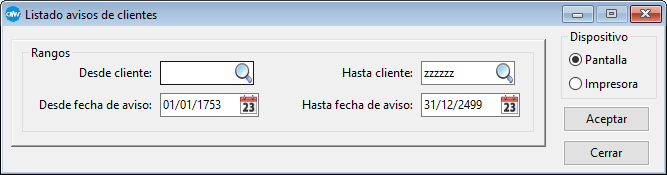 Para acceder al proceso debemos ir al menú: <Despacho><Listado de avisos de clientes> (desde el menú antiguo la ruta es <Despacho> <Informes> <Avisos de clientes>).