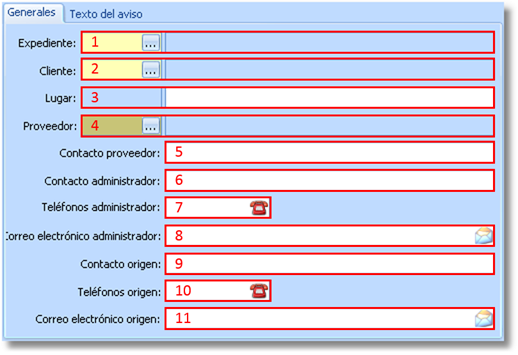 Esta pestaña contiene la información asociada con el aviso, conformada por el expediente para el que se genera el aviso, el cliente que lo produce, el lugar donde se originó el aviso, el proveedor al que va dirigido y datos y direcciones de contacto.