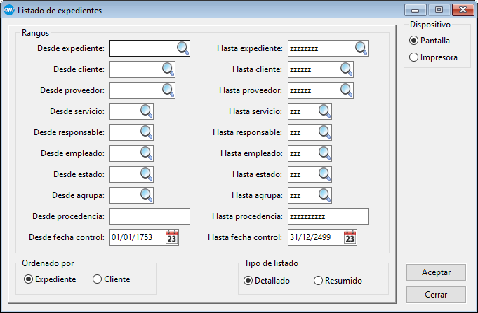 Este proceso nos permite obtener la ficha completa, si el tipo del listado es detallado, o un listado resumido de los expedientes que cumplan las opciones de selección.
