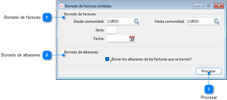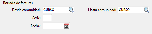Este proceso nos permite borrar una facturación en un rango de entidades (mancomunidad/comunidad, arrendador o empresa).