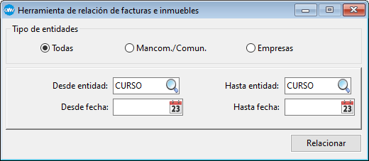 Con ella podremos relacionar las facturas en el rango de empresas que queramos y entre las fechas que deseemos. Si no se establecen filtros la aplicación actualizará todas las empresas y sus facturas.
