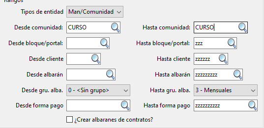 Todos los albaranes, tanto los existentes como los que se generen a partir de los contratos, se agruparán según sus características, es decir, si todos los albaranes son de alquiler se creará una sola factura con todos esos albaranes, pero si alguno no lo es, se creará una factura por separado con ese albarán.