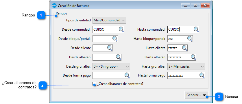 Este proceso crea la facturación a partir de los contratos con los clientes y de los albaranes que existieran sin facturar.