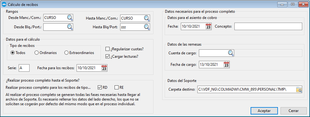 El proceso de cálculo puede realizarse para un rango de mancomunidades/comunidades y bloques/portales.
