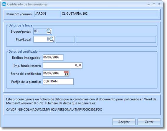 El proceso nos permite confeccionar el certificado de transmisiones para un piso o local.