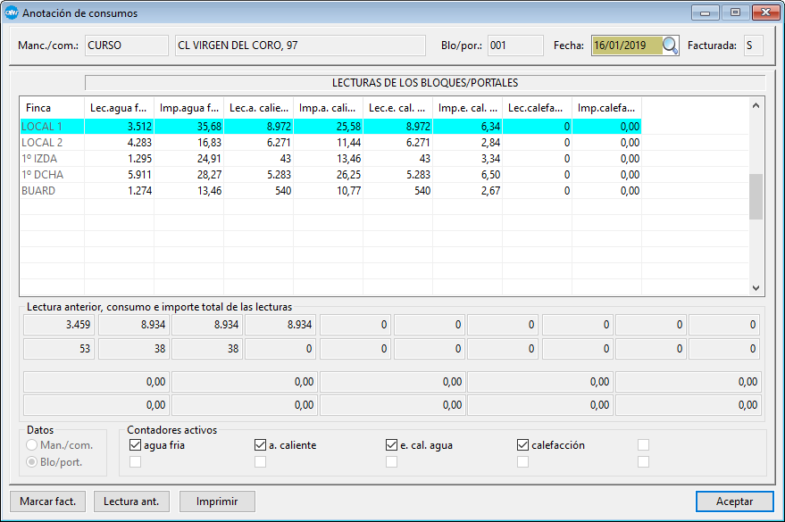 NOTA: cuando damos de alta una nueva mancomunidad/comunidad es necesario introducir la lectura anterior para el cálculo de consumo. El motivo es que como solo se introduce la lectura actual el programa necesita conocer la lectura anterior para el cálculo de consumo. En este caso y para que los importes no se carguen a los propietarios marcar el botón Marcar fact. que permite marcar la lectura como ya facturada.