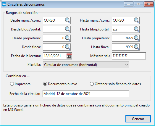 Este proceso nos permite emitir una circular informando a los propietarios de los consumos de sus fincas para la fecha indicada en el dialogo. La circular se emite utilizando la opción de combinación de correspondencia de Word.