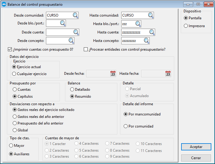 •El control presupuestario puede obtenerse para un rango de entidades (man/comunidades, empresas o arrendadores), subentidades (bloques/portales, delegaciones o propiedades), cuentas y conceptos.