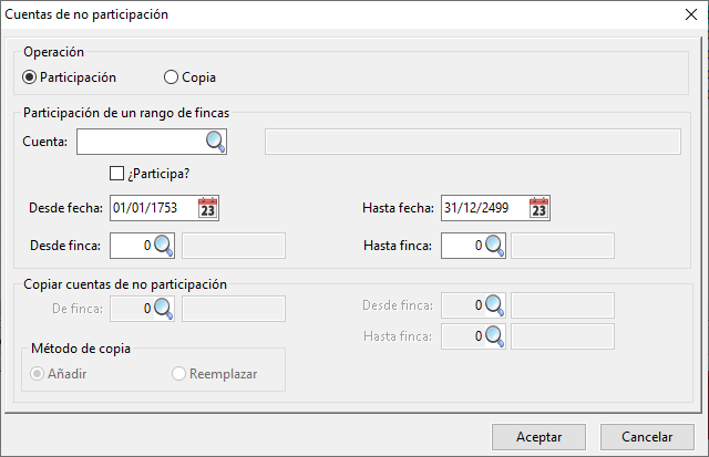Este botón nos permite asignar una cuenta de no participación a un grupo de fincas, operación participación, o copiar las cuentas de no participación de una finca a otra/s, operación copia.