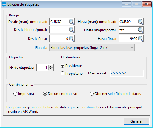 •Para la obtención de etiquetas podrá indicarse un rango de mancomunidades/comunidades, bloques/portales y fincas.