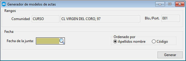 Este proceso permite obtener el modelo de acta de la mancomunidad/comunidad y junta cuyos datos se indiquen por pantalla.