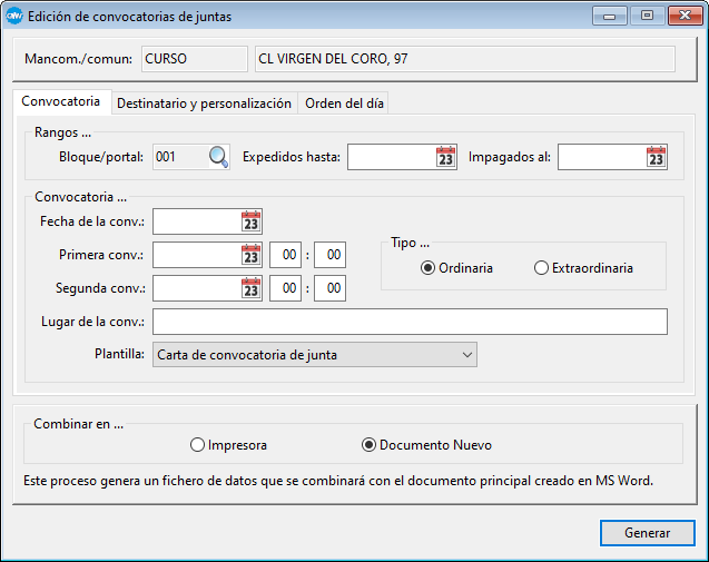 •Personalización: en esta pestaña indicaremos el tipo de destinatario de la convocatoria (si se selecciona el tipo Personalizado introduciremos los datos del destinatario manualmente, en caso contrario se crearán cartas de convocatoria nominativas a cada finca/propietario que cumpla la máscara de selección o una sola carta para el presidente de la comunidad).