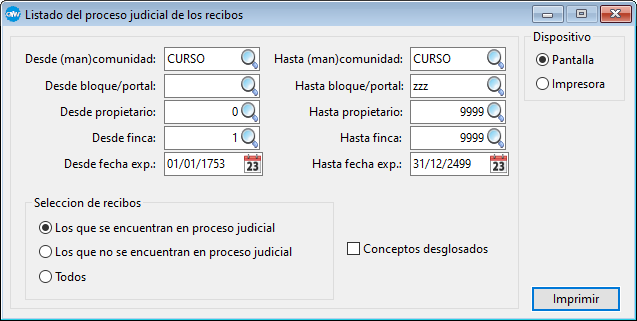 Este proceso nos permite obtener un listado de los recibos en proceso judicial.