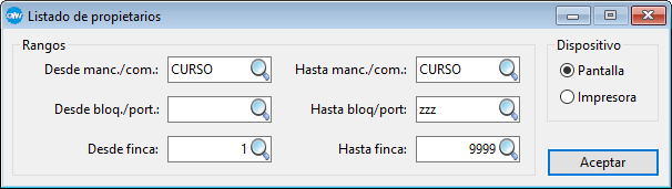 El listado podrá obtenerse para un rango de mancomunidades/comunidades, bloques/portales y fincas.