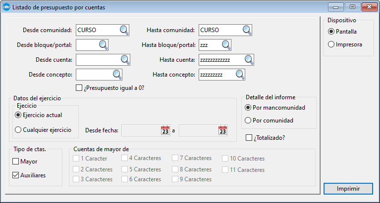 •El presupuesto puede obtenerse para un rango de entidades (man/comunidades, empresas o arrendadores), subentidades (bloques/portales, delegaciones o propiedades), cuentas y conceptos.