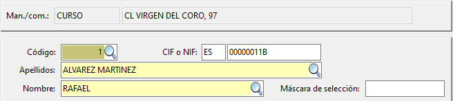 En la parte superior de la pantalla vemos la identificación del propietario, su código (que puede ser manual o asignado por el ordenador, para que lo asigne el ordenador debemos dejarlo a 0 cuando demos de alta un nuevo propietario), NIF, apellidos y nombre.