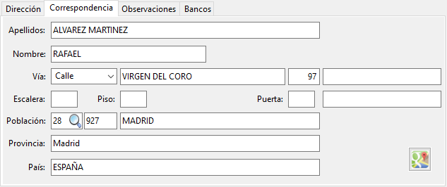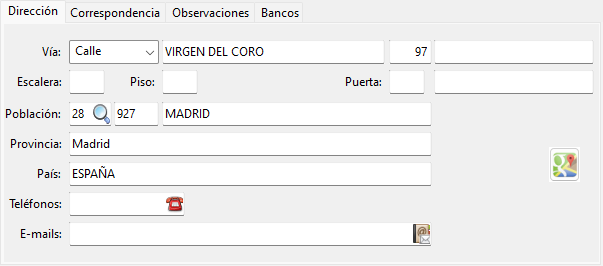 En la parte inferior tenemos las siguientes pestañas: Dirección, Correspondencia, Observaciones y Bancos.