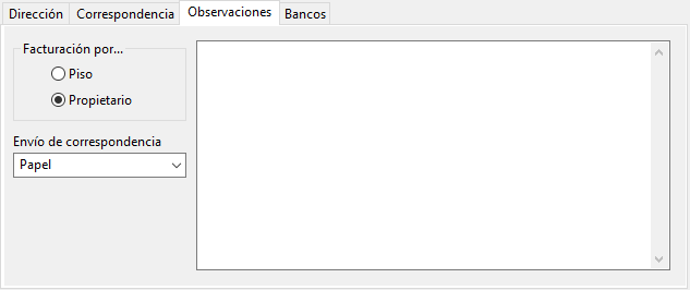En esta pestaña indicaremos si la facturación se realiza por pisos o por propietarios, si se envían facturas al propietario, el medio por el que se le envía la correspondencia y otras observaciones que deseemos reflejar en su ficha.