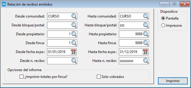 El proceso puede obtenerse para un rango de mancomunidades/comunidades, bloques/portales, fincas, números de recibos y fechas de expedición.