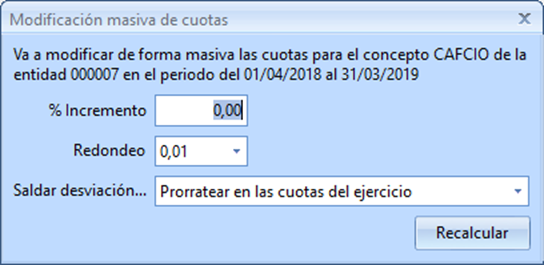 •Prorrateo: La desviación se saldará poco a poco durante el ejercicio, se dividirá la desviación entre el nº de cuotas, sumándose a la cuota calculada para el concepto. Por defecto es la metodología que se usa.