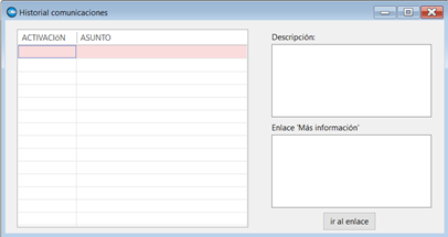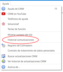 A diferencia de otros mensajes informativos, que una vez leídos desaparecen del área de notificaciones, las comunicaciones publicadas pueden ser consultadas en el Historial de comunicaciones desde el menú: <Ayuda> <Historial de comunicaciones>.