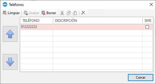Cuando un campo de teléfonos se presenta vacío (en blanco) indica que la lista de teléfonos está vacía por lo que no se tendrá acceso a ella. En este caso primero se debe rellenar el campo y guardar. Tras el guardado la lista ya tendrá al menos un teléfono y se activará el acceso al diálogo de teléfonos.