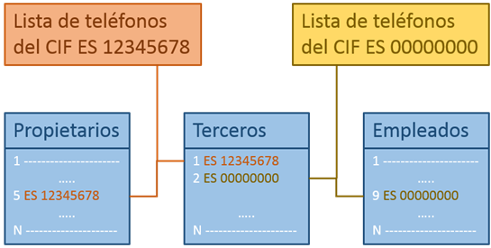 Según el ejemplo de la imagen anterior, si se modifica la lista de teléfonos del propietario con CIF ES 12345678, los cambios se están aplicando también a la lista de teléfonos del tercero con CIF ES 12345678 pues comparten la misma lista ya que representan la misma persona.