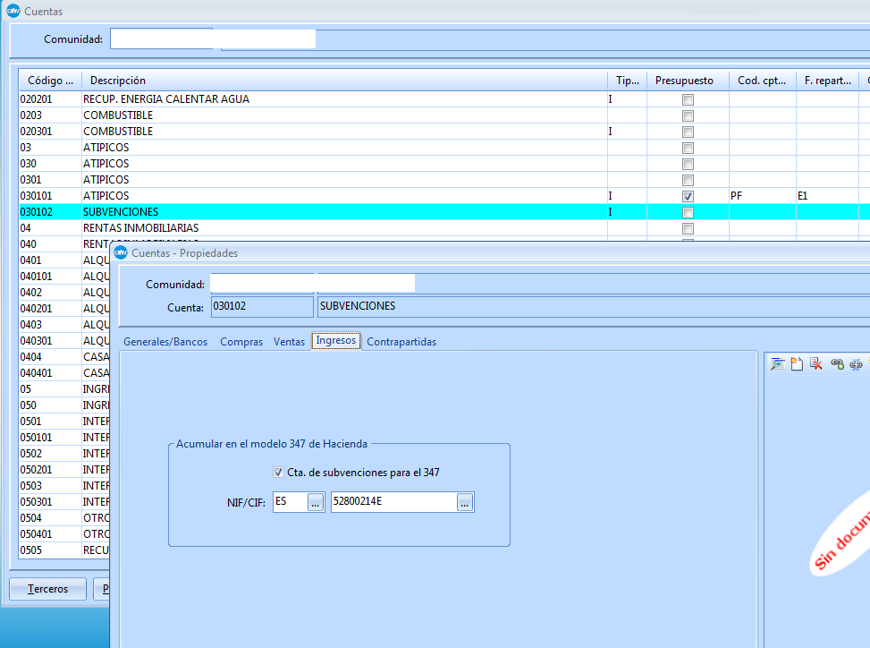 2.En las propiedades de la cuenta contable, pestaña de “Ingresos”, marque “Cta. de subvenciones para el 347” e introduzca el NIF del organismo que ha concedido la subvención.