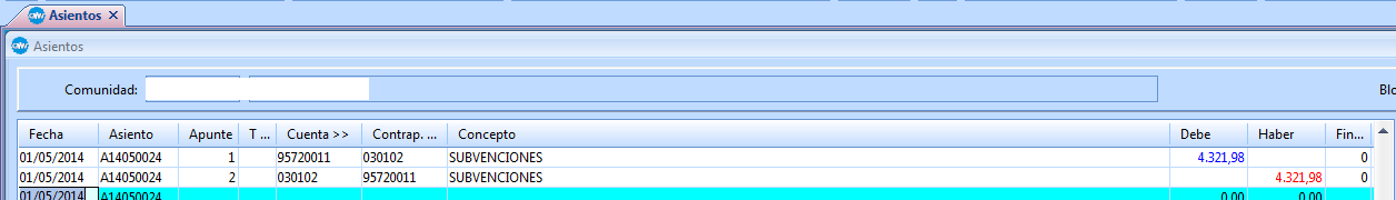 A continuación podrá ver un ejemplo en el que se muestra una subvención recibida por una comunidad. Tenga en cuenta que los datos son figurados: