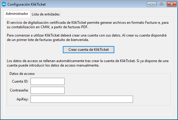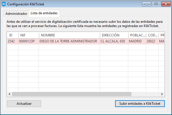 Al crear la cuenta del administrador se da de alta automáticamente en KlikTicket la primera empresa (con los datos de la cuenta). Los datos del resto de entidades deben subirse manualmente.