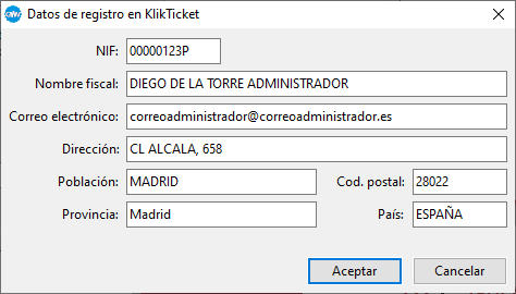 Al pulsar el botón "Crear cuenta de KlikTicket" (habilitado si no se dispone ya de datos de acceso) se solicitan los datos básicos para dar de alta al administrador en KlikTicket (NIF, nombre fiscal, correo electrónico, dirección, población, código postal, provincia y país).