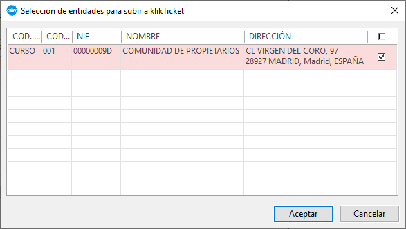 Al aceptar el diálogo se lanza un proceso que recorre las entidades seleccionadas dando el alta de los datos en KlikTicket. Si se seleccionan varias entidades con el mismo NIF solo se dará el alta de la primera de ellas.