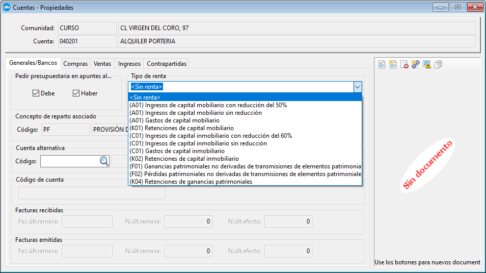 Dentro de las Propiedades de la cuenta, en la pestaña Generales, se ha de indicar cuál es el Tipo de renta que se contabiliza.