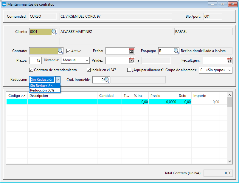 Hay que acceder al Mantenimiento de contratos y, en este caso, hay que marcar la casilla Contrato de arrendamiento, indicando, si lo hubiese, el porcentaje de Reducción.